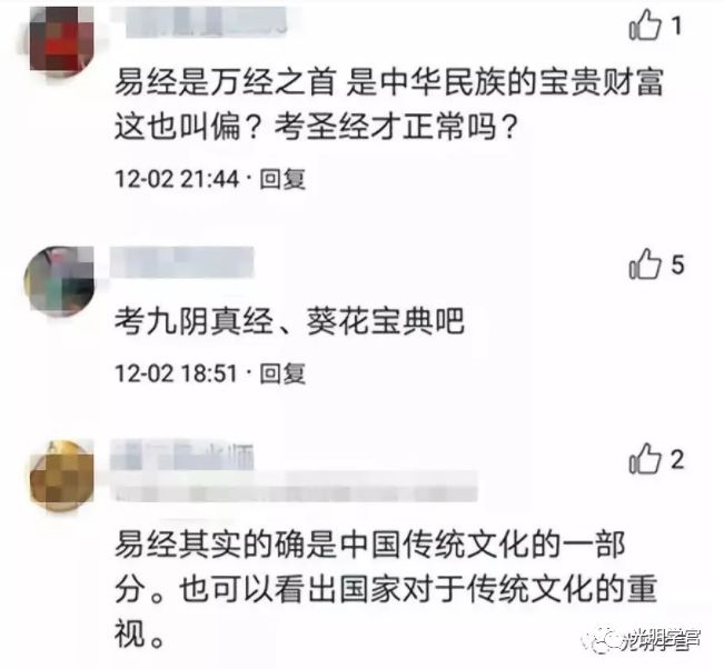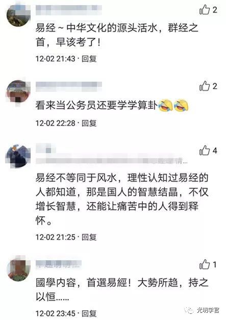 有部分网友发出“当公务员还要学学算卦”等类似调侃。但大部分网友则认为“肯定要考,中国人连《易经》都不懂,做什么干部”、“《易经》是中华文化的源头,被列为群经之首,早该考了!”,考《易经》是对优秀传统文化的重视,此举值得点赞。