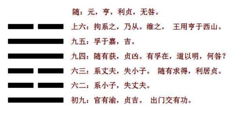 随卦的主要精神就是上下和顺,彼此精诚团结。相互顺从,己能随物,物能随己,彼此沟通。随必依时顺势,有原则和条件,以坚贞为前提。