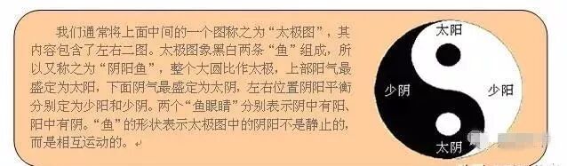当阴阳两仪继续交融变化就形成了四象,所谓四象即:少阳、太阳、少阴、太阴。这可以用凌晨、中午、黄昏、夜晚来比喻。凌晨时阴阳二气大致相当,上为阳下为阴,说明天上太阳的热量尚未完全到达地面,当到了中午时分阳气最盛,所以为太阳,随后阴气渐长而阳气渐衰,至黄昏时分又大致相当,形成下面为阳上面为阴的格局,这就是少阴,等夜幕完全降临的子夜时分,阴气最盛,所以称之为太阴,此后阴衰阳长,至凌晨时阴阳又大致相当,如此周而复始,日复一日。当然用春夏秋冬也同样可以说明这一现象。