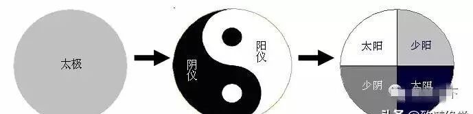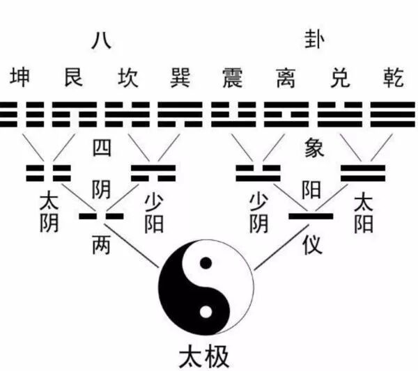 周易的系辞中说:“有太极,是生两仪, 两仪生四象, 四象生八卦,八卦定吉凶,吉凶生大业。”易经认为,盘古开天地之前,也就是宇宙大爆炸之前,宇宙就是一太极(即物理学中所说“质点”),这个太极之内包含阴阳二气,阴阳二气交融在一起,相对地来说比较安静稳定的状态,这时称之为太极状态,简称太极。当内部的阴阳二气发生交融变化时,我们称之为两仪状态,简称两仪。