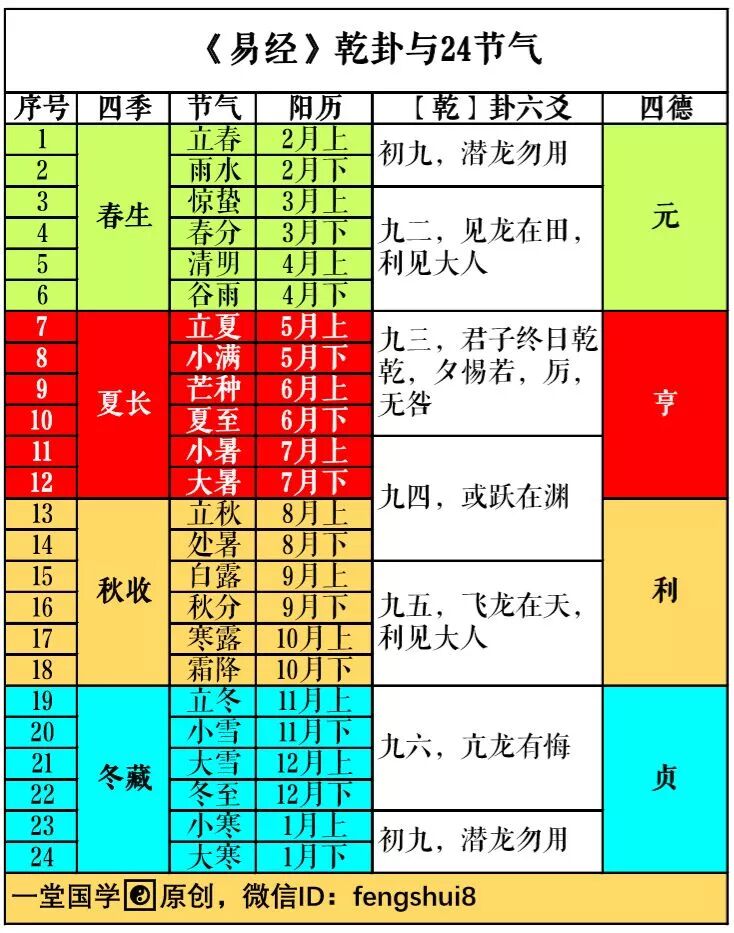 其次,【乾卦】六爻所描述的“龙”的变化与四季节气的变化有对应关系。如图: