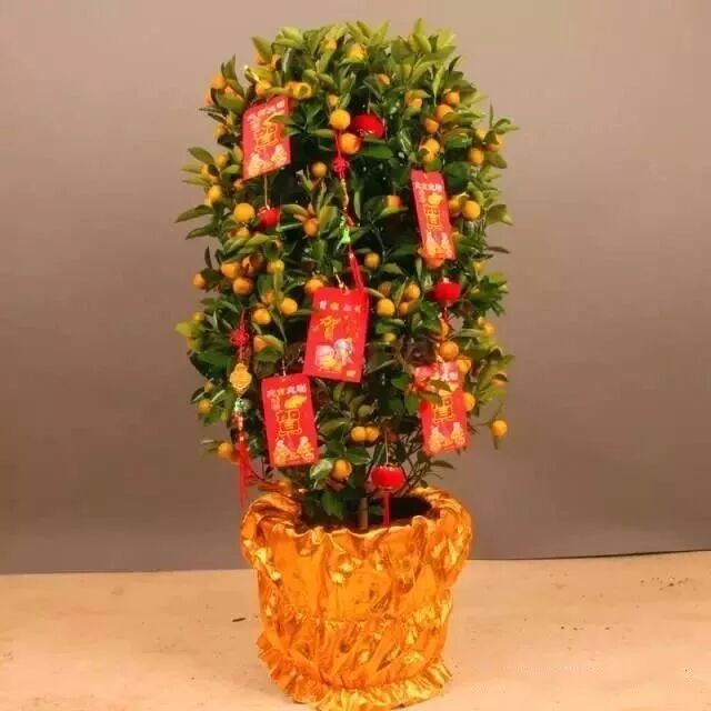 桔为吉,金为财,金桔也就有了吉祥招财的含意。金桔树可以摆在家中,也可以作为贺礼,在拜年用的果篮里放上一些金桔,是很好的祝福方式。需要注意的是,选购盆桔时一定要挑选果满(因果疏有“凶多吉小”之意)、果色要红润、枝叶要碧绿不要有黄叶。