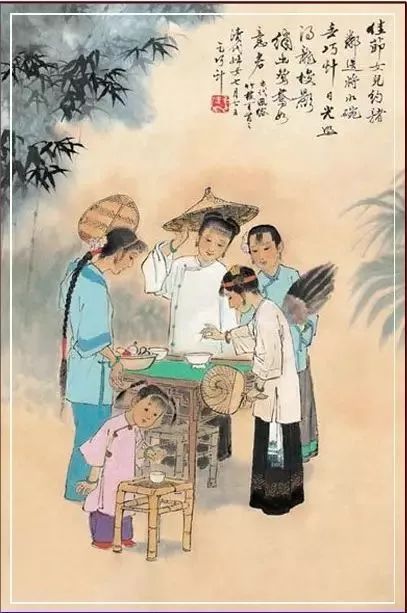 女子望着月亮穿针引线,然后将小蜘蛛和针线放在盒子里,等到明天再去观看,如果里面结成的网是圆的,就说明得到了织女的护佑,能够成为一个心灵手巧的女子。