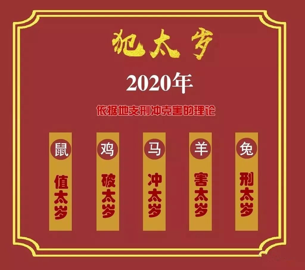 2020年是庚子年,庚为金,子为鼠,太岁星君为卢秘大将军,根据流年地支与五行生克的关系,我们可以得知,2020年生肖鼠为值年太岁,也就是本命年了。目前有不少的人其实不太明白生肖和地支间的关系,所以只认为犯太岁的这一年里只有一个本命年的。比如2020是鼠,很多人就只知道鼠犯太岁,其他的根本不明白。准确来说,跟当年值年的属相冲害破刑的生肖也在犯太岁的流年运格里。由此推出,2020年犯太岁的生肖共计有5个:鼠犯太岁(本命值太岁)、马(冲太岁),羊(害太岁),兔(刑太岁),鸡(破太岁)