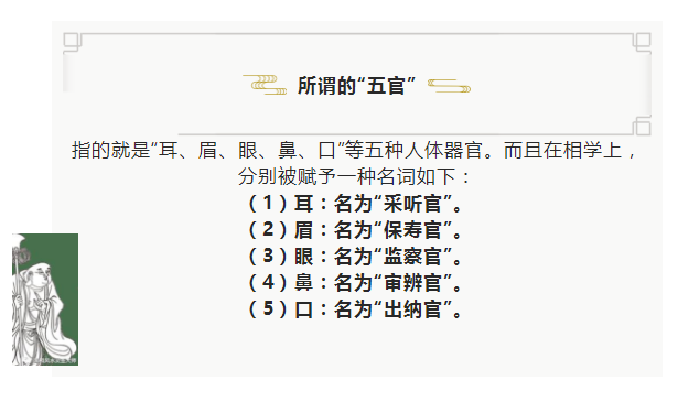 大家常常说“那个人的‘五官’怎样怎样…;这个人的‘五官’怎样怎样…”,但是大家不见得很清楚什么是“五官”,其实“五官”是相学上的东西。