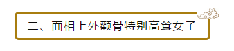 有句已经被我说得耳朵都快要起茧子的话:“女人颧骨高,杀夫不用刀”,这句说可能说得有些过头了,但是呢,颧骨高的女子,婚姻上是不太会那么顺利的(特别是外颧高的女子);在这里建议,拥有此类外颧骨高耸的女子,在婚姻生活中,尽量找个性格相对比较温和的男人,才能够勉强维持表面上的夫妻和谐,如果找的能力强,而且个性也强的男子,怕是很难过到一块去的,最终夫妻双方会分道扬镳的,这个真不是吓唬您,真的有这么严重。