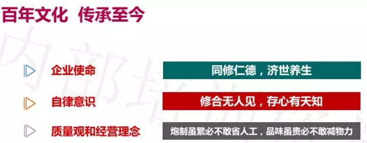 北京同仁堂创建于清康熙八年,有着349年的悠久历史,是中药行业著名的老字号,产品素以“配方独特、选料上乘、工艺精湛、疗效显著”而驰名中外。同仁堂的品牌在中国更是家喻户晓,有着几百年的历史,延续到今天,品牌的彰显更多的是代表着一个产品的质量,企业文化的浓缩也是一种质量的体现。