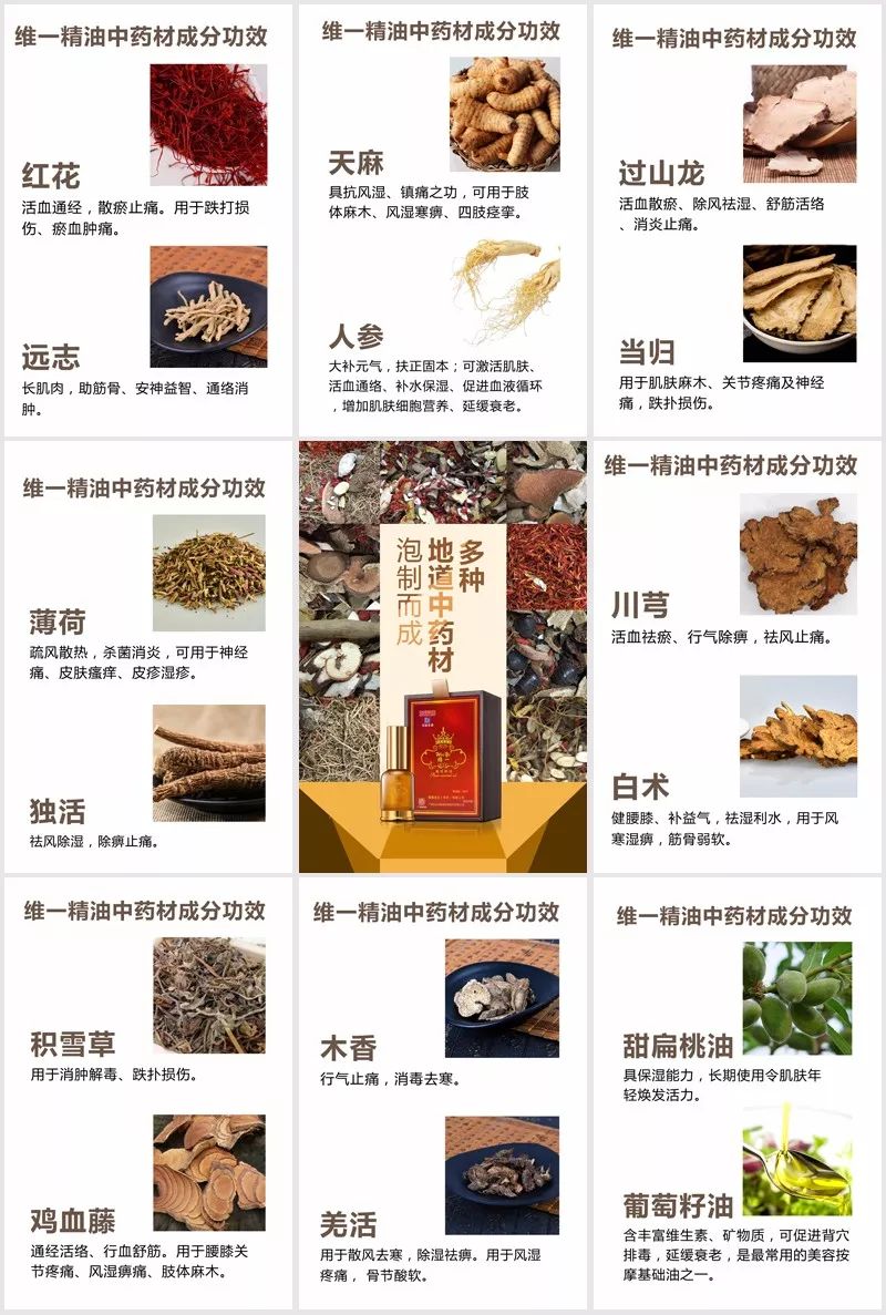 白云山维一植物精油 由多种中草药浸泡提炼而成,成份有人参,红花,远志,木香,天麻……等多种经络养元地道古方,结合现代高科技精纯提取技术及药物纳米渗透科技。
