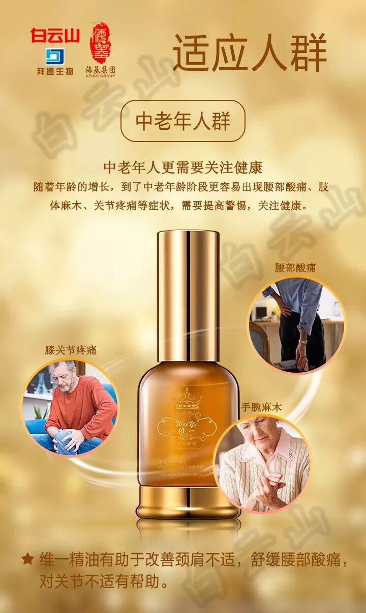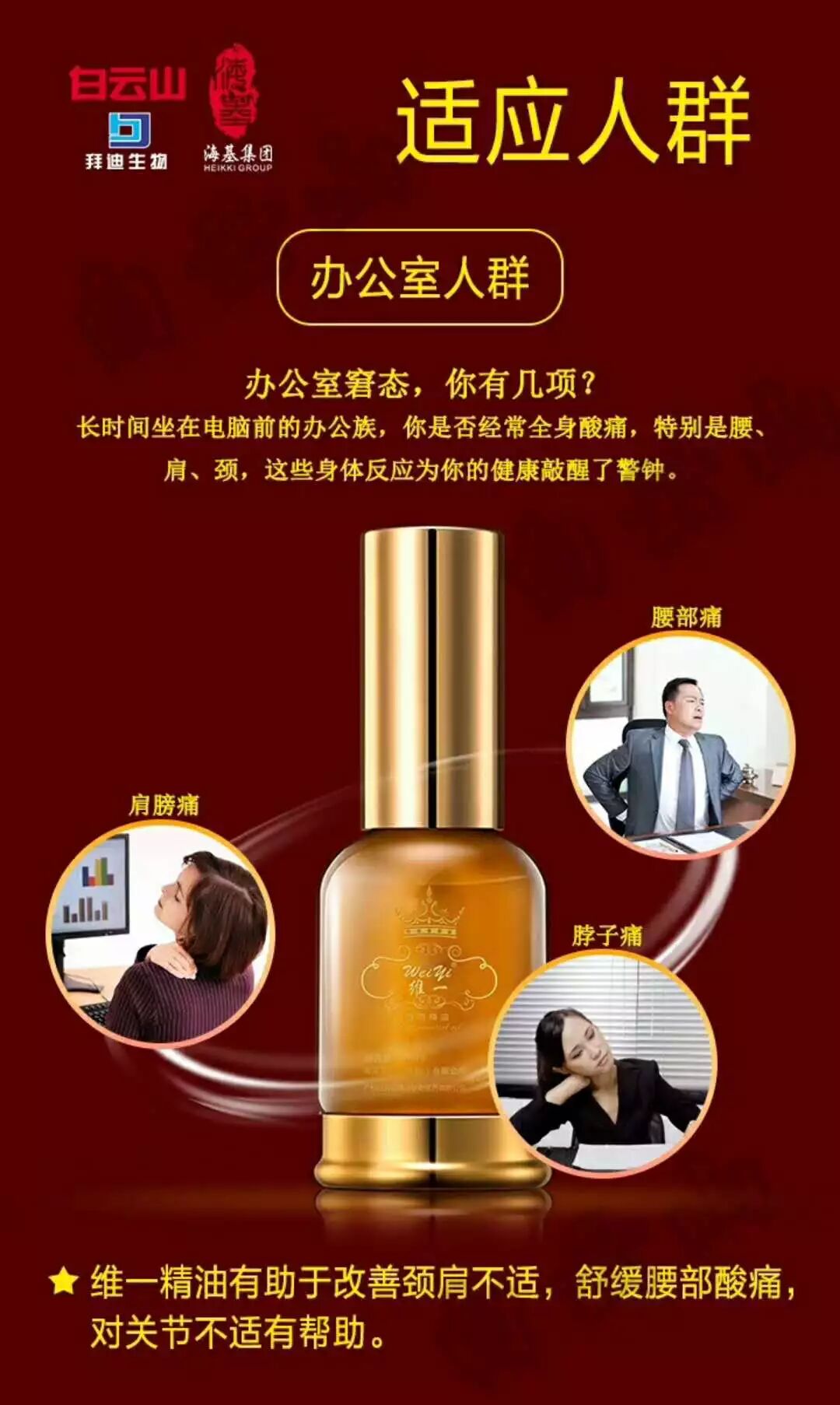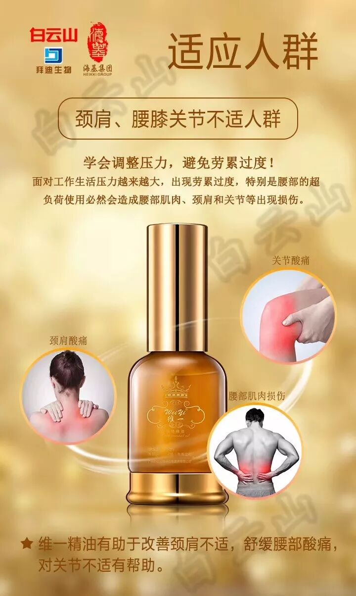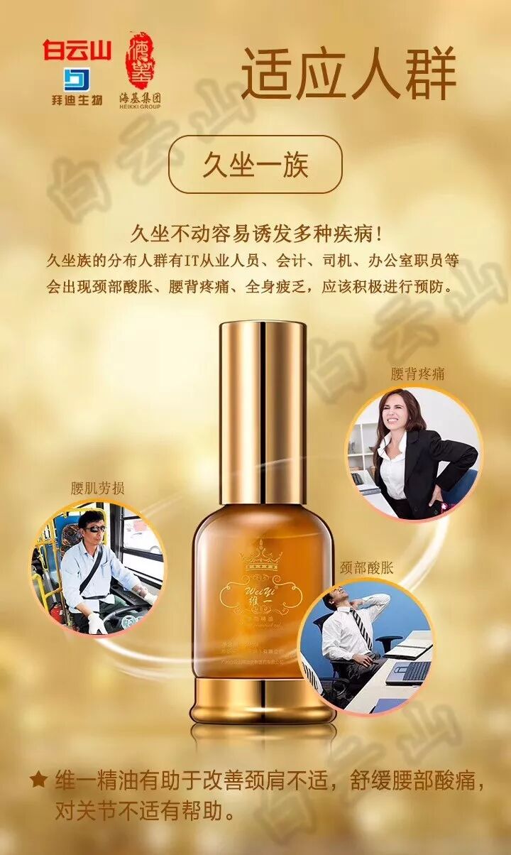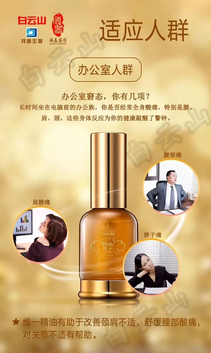 白云山维一植物精油是广药白云山和海基集团联合推出一款针对低头一族、久坐一族、办公室人群、中老年人群、重体力劳动者、亚健康人群等各类颈、肩、腰、腿、疼痛的产品!