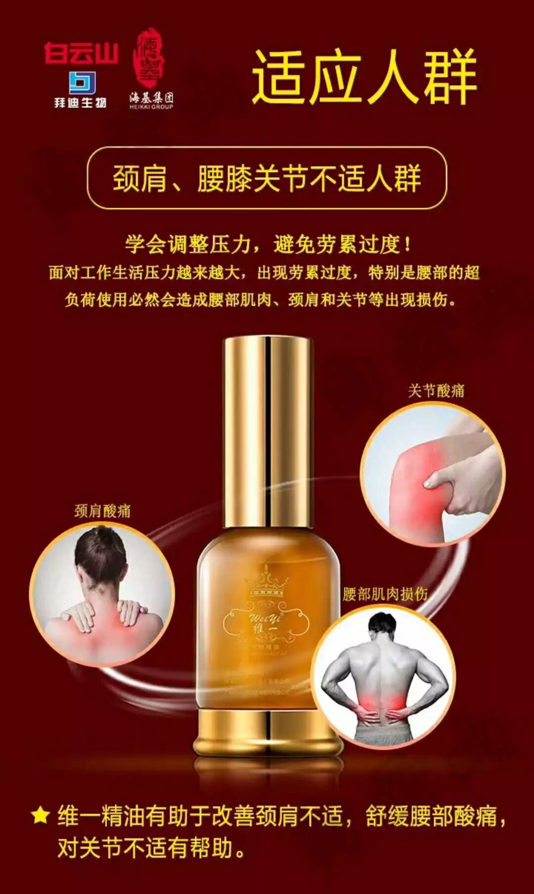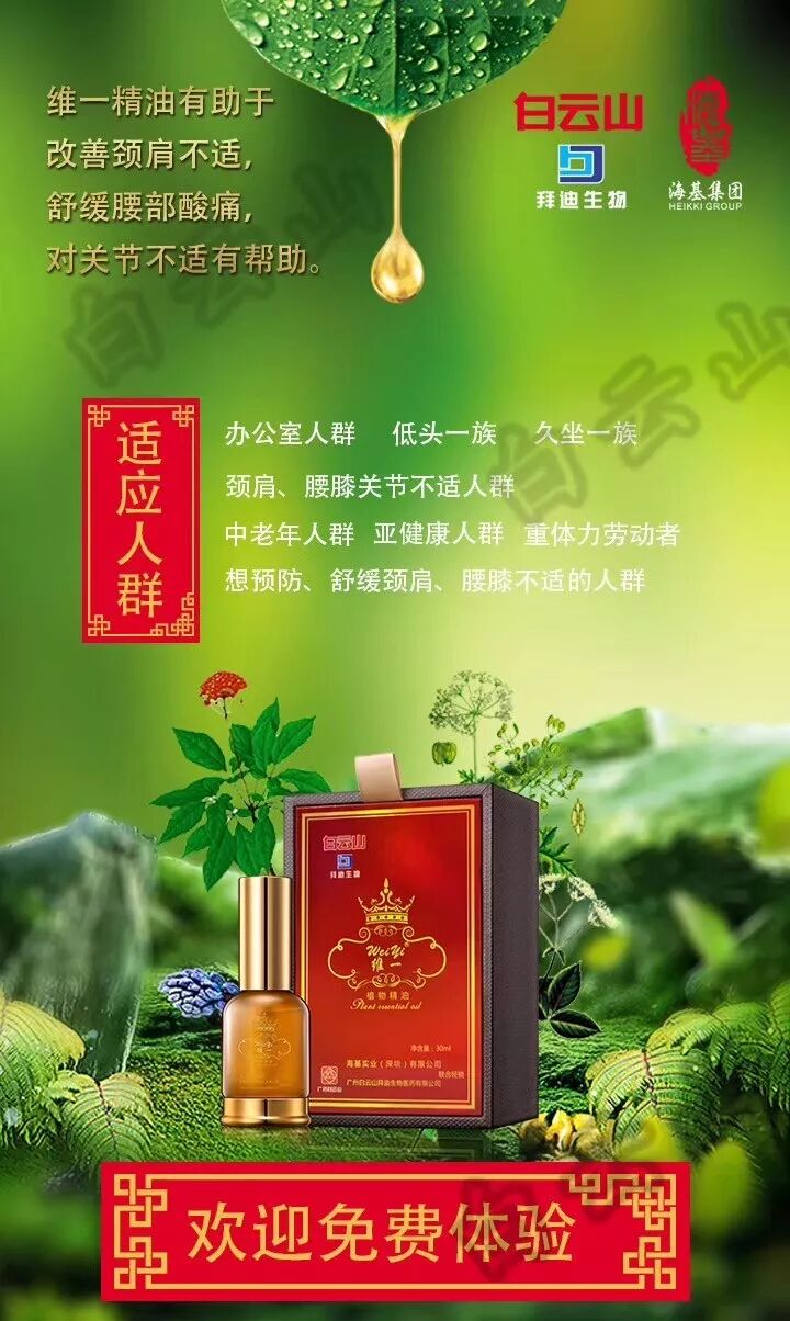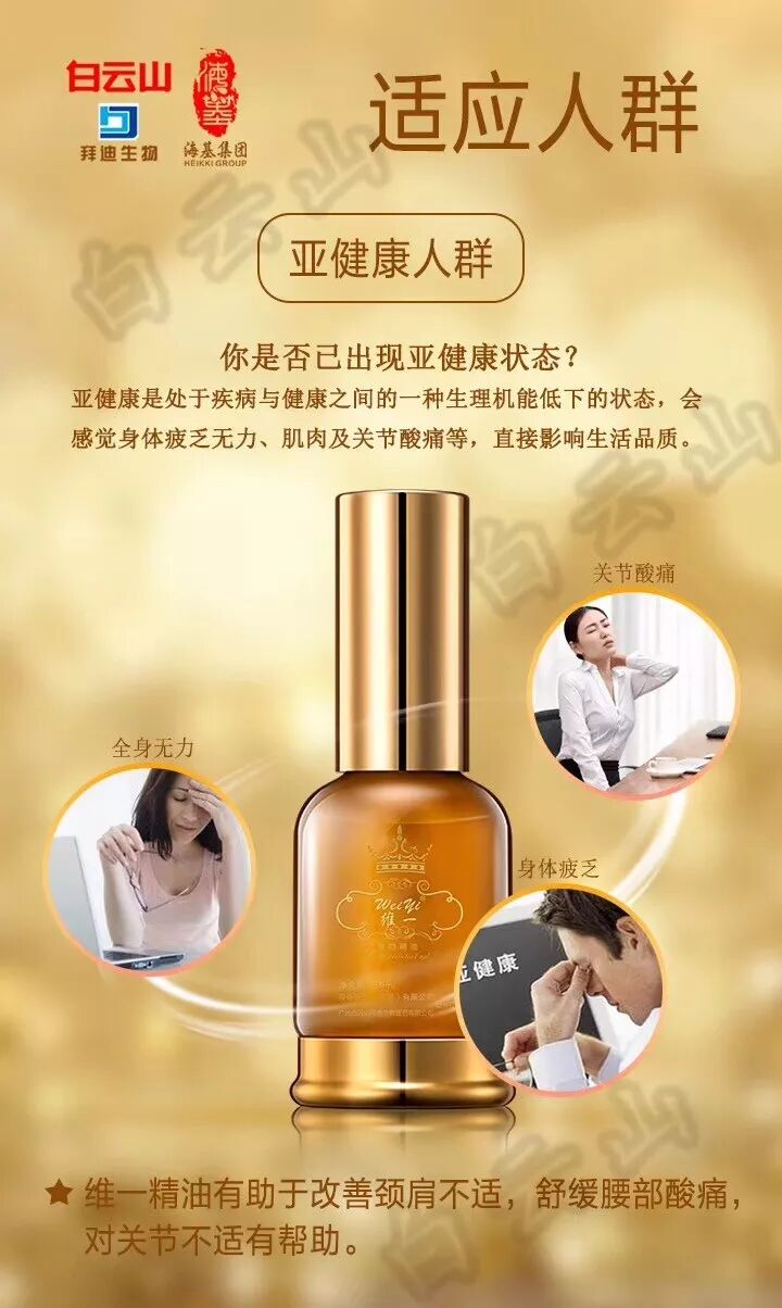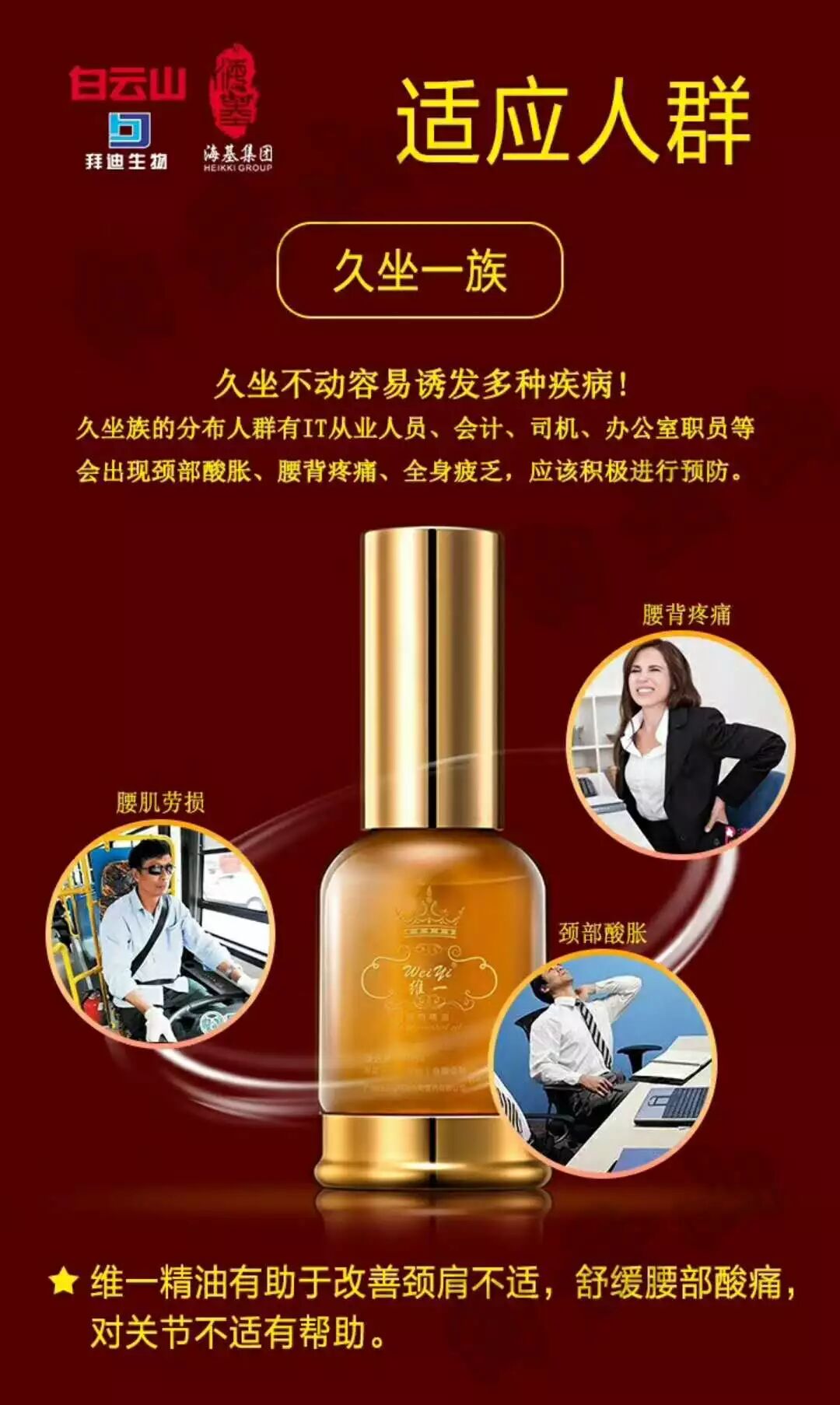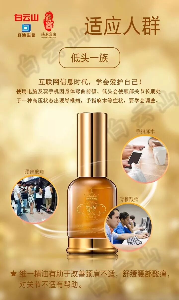 白云山维一植物精油是广药白云山和海基集团联合推出一款针对低头一族、久坐一族、办公室人群、中老年人群、重体力劳动者、亚健康人群等各类颈、肩、腰、腿、疼痛的产品!