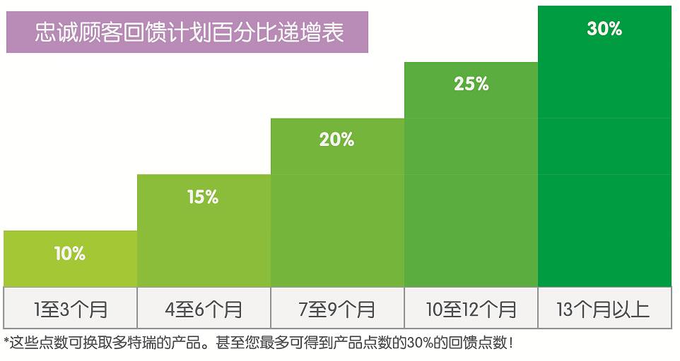 大多数产品都有其对应点数,当您加入忠诚顾客回馈计划后,购买产品时您可获得回馈点数。回馈点数的计算方式为:产品对应点数之和乘以回馈百分比。(如您的订单各产品点数之和为200点,您的回馈百分比是15%,则您可以获得200X15%=30点)回馈百分比与您持续忠诚顾客回馈计划的时间成正比。所以您持续忠诚顾客回馈计划越久,您获得的点数越多。