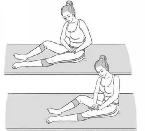 推腿,坐下,先把左腿弯曲,膝盖放平,让双手掌交叠按在左大腿根部内侧,稍用力向前推到膝盖,先左后右,各五十遍。