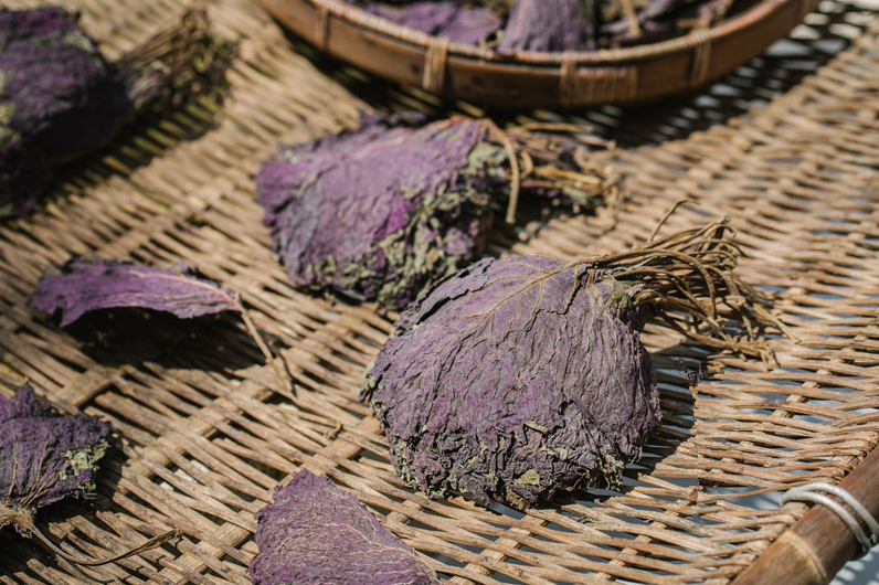《调鼎集》载:“平时将薄荷、胡椒、紫苏、葱、香橼皮、桔皮、菊花及叶同晒干,捶碎收贮。剖鱼入水,取以洗擦,不但解腥,其味尤美。”用泡菜坛泡菜时,放点紫苏叶,也可使泡菜别有风味。