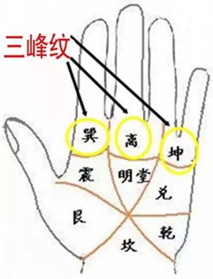 《玉管照神局》:“三峰堆起巽离坤,肉满高如枣样圆,光泽更加红润色,家中金玉有良田。”三峰纹,指的是巽宫、离宫、坤宫三个部位比较饱满,像山峰一样。巽宫在食指根部之下,离宫主要在中指根部之下,坤宫主要在无名指根部之下。“财在巽宫,官在离宫,禄在坤宫”,这三个部位有一处隆起就很好,更别说是三处了。