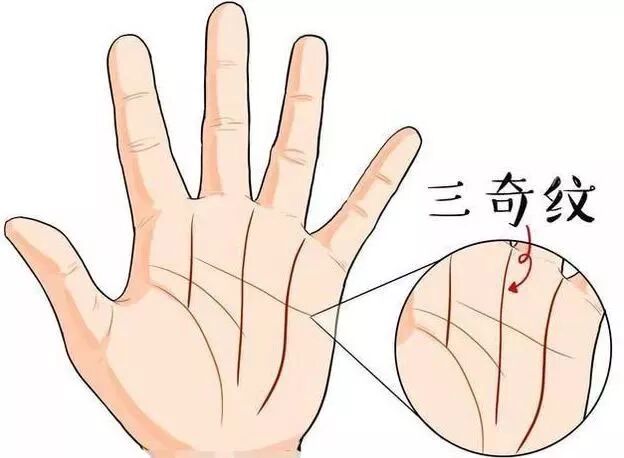 《玉管照神局》:“三奇纹现无名指,一路分开三个纹,生在震宫并掌内,必作金门食禄人。”这三条纹并驾齐驱,形成树的形状,所以又被称作“摇钱树”。掌中有“摇钱树”的人,了不得,一生富贵,名利双收,能成大事。