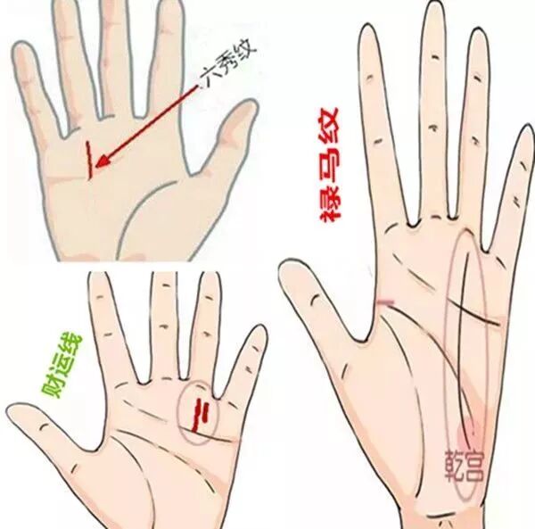 《手相歌诀》:“六秀入掌中,处事好心胸,贫人成大富,谋职禄位丰。”六秀纹,在无名指根部下面,天纹上面,是两者之间的一条直纹,又被称为“偏财纹”“六合纹”“异路纹”。如果在六秀纹的一侧出现与它平行的短纹,相当于是一种辅佐,那更是锦上添花,这种掌纹在西方手相学里叫做“财运线”“创作线”。如果六秀纹从无名指根部向下,一直延伸到掌心,甚至到手掌底部,这样的掌纹被称作“禄马纹”。有禄马纹的人大富大贵,如果再配上好的面相,有可能成为帝王身边的高人。
