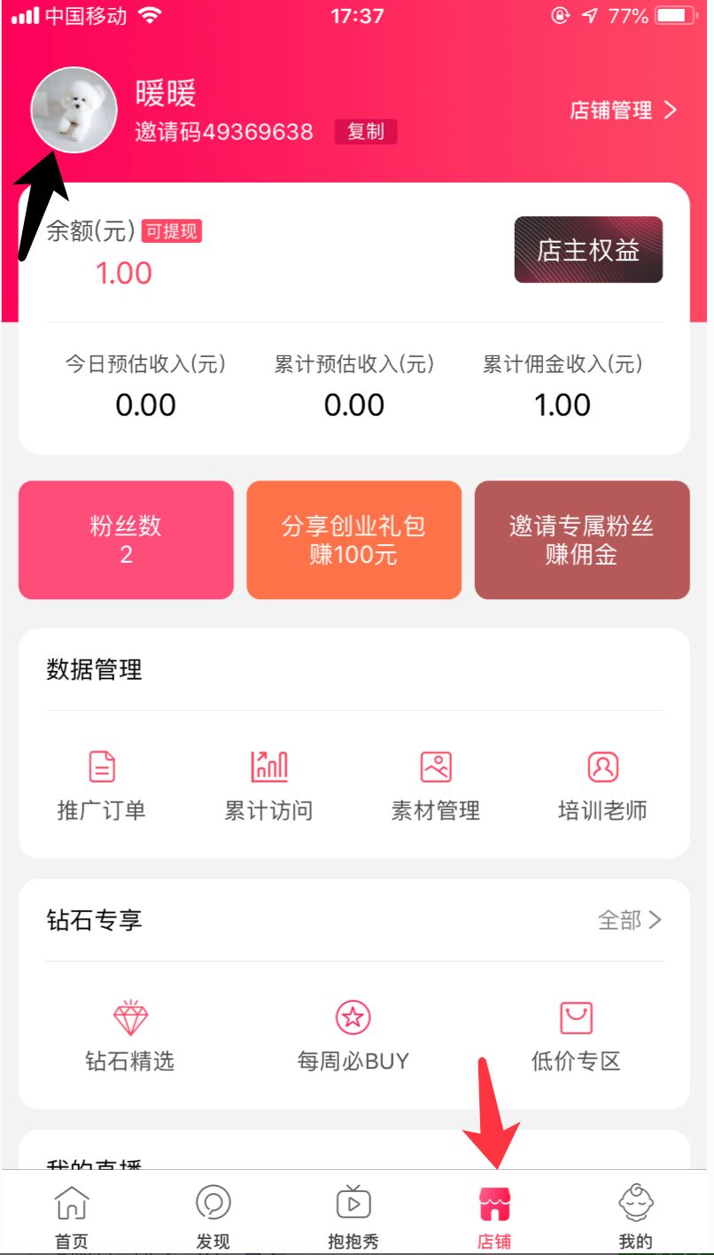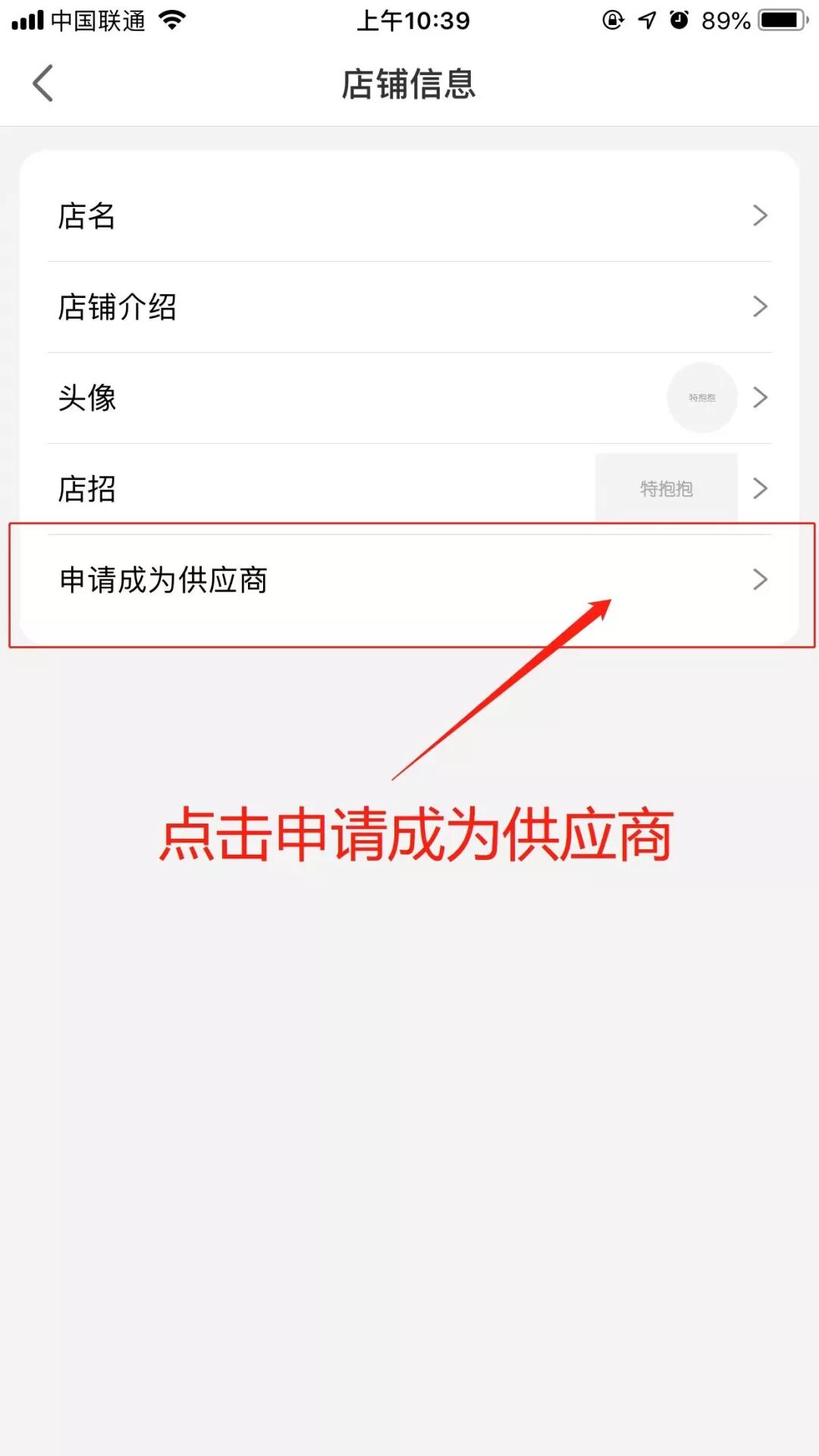 2. 在“店铺”里面点击个人头像,选择“申请成为供应商”