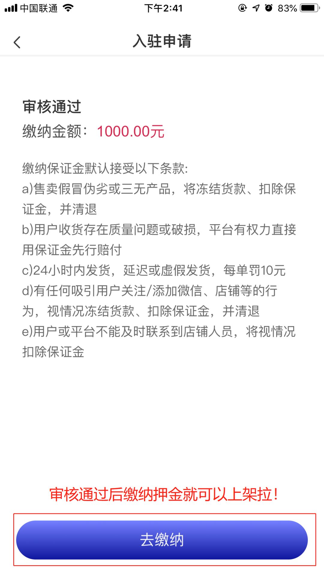 6.审核通过后缴纳押金就可以上架啦!