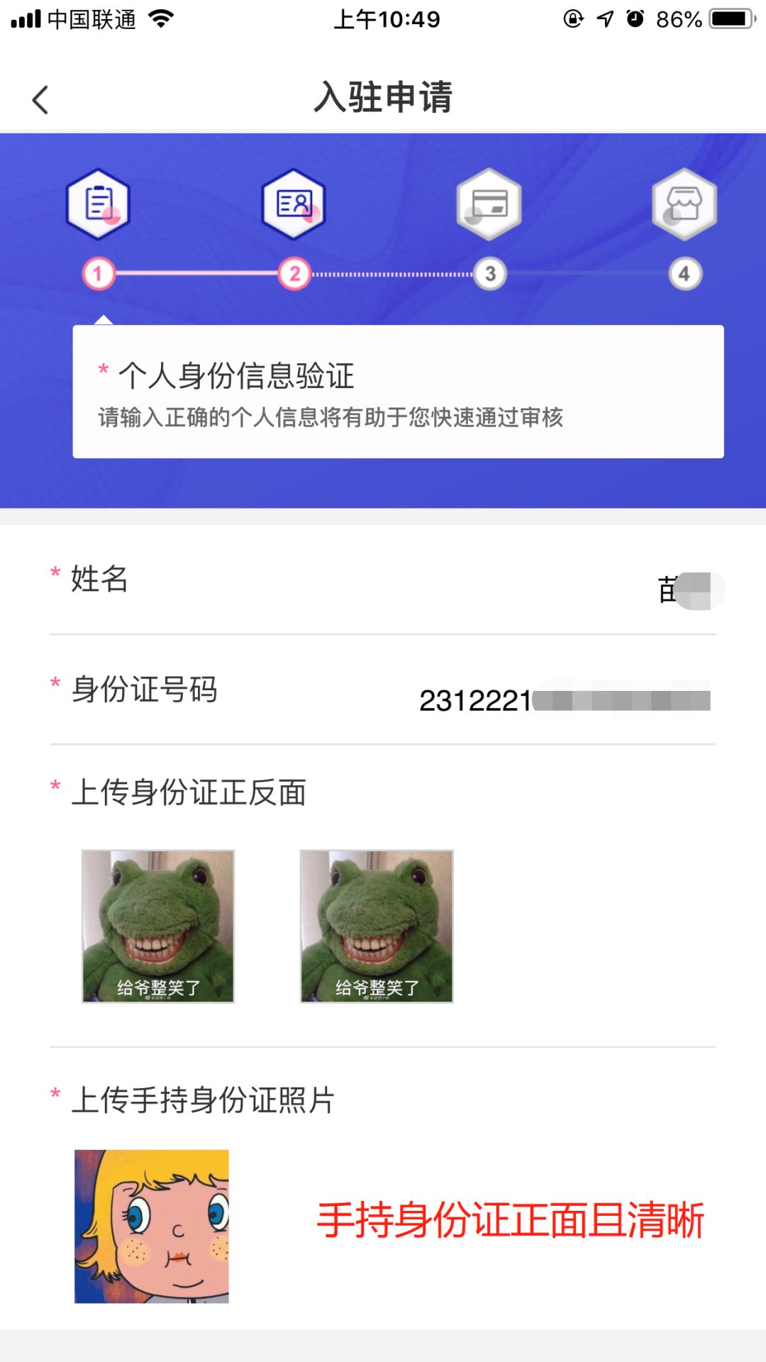 C.请根据示例上传清晰的身份证照片,身份证有效期与法人身份证国徽面信息一致。