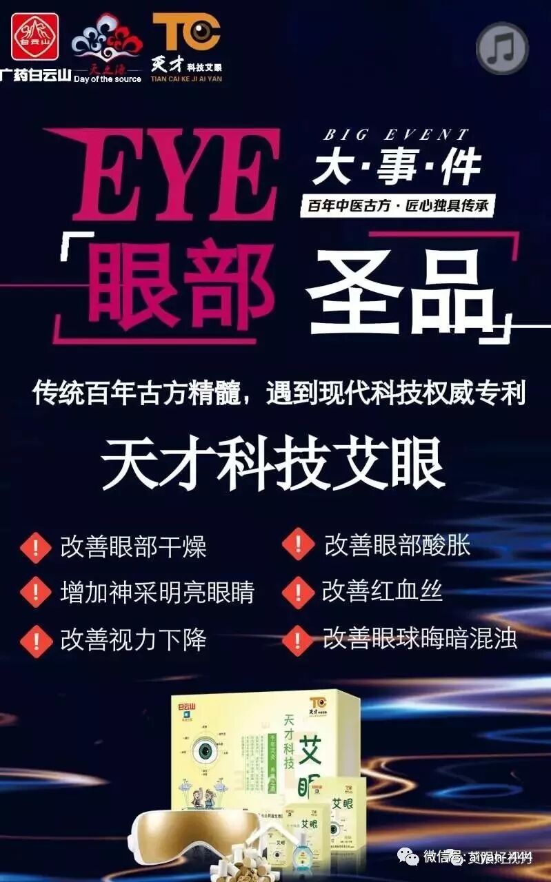 广药白云山天才科技艾眼灸! 针对人群:眼干、眼涩、眼疲劳、视力模糊、青光眼、黑眼圈、白内障,眼袋,皱纹,产品特色:调理各种眼部疾病,(近视,弱视,散光,远视,老花眼,青光眼,白内障,飞蚊症) 保养,护理,美容眼睛,(眼干,涩,痛,痒,红血丝,眼袋,黑眼圈,眼角皱纹!熊猫眼,改善睡眠,增加记忆力!养肝补肾,清热解毒!适合年龄儿童️3岁以上老年人️️70岁以下均可