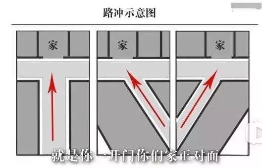 就是你一开门家对面,有一条很长且窄的路对着你,这种路就属于路冲,俗语讲“一条直路一条枪”,如果有个人整天拿着枪对着你,你说能舒服嘛!时间久了,凡是住这种房子的人,都会导致破财,或者遇到其他一些导致离婚的霉运。