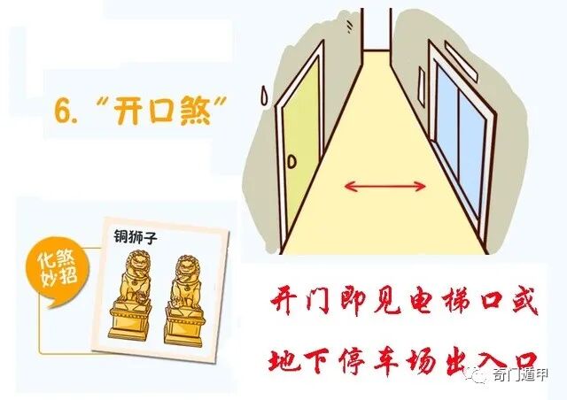 6、开口煞:又称虎口煞,如门向电梯口或地下停车场出入口,影响健康、财运,严重者易有血光之灾。