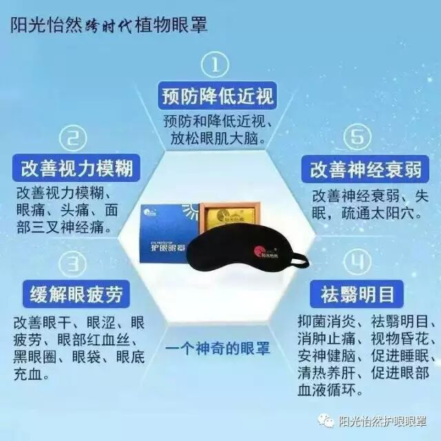 阳光怡然护眼眼罩:采用中医经络的原理,野生纯植物特色理疗功效,通过热效应吸收的原理,打开眼周穴位,疏通眼部经络,促进眼睛微循环,恢复改善眼睛生理机能,增强眼睛生理功能的效果,是人们生活用眼过度护眼佳品。