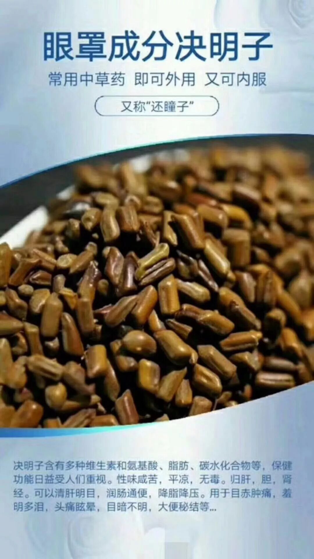 作用 :决明子是“决明”的种子,为常用中药,种子入药,具有清肝明目、通便的功能。主治高血压、头痛、眩晕、急性结膜炎、角膜溃疡、青光眼、痈疖疮疡等症。