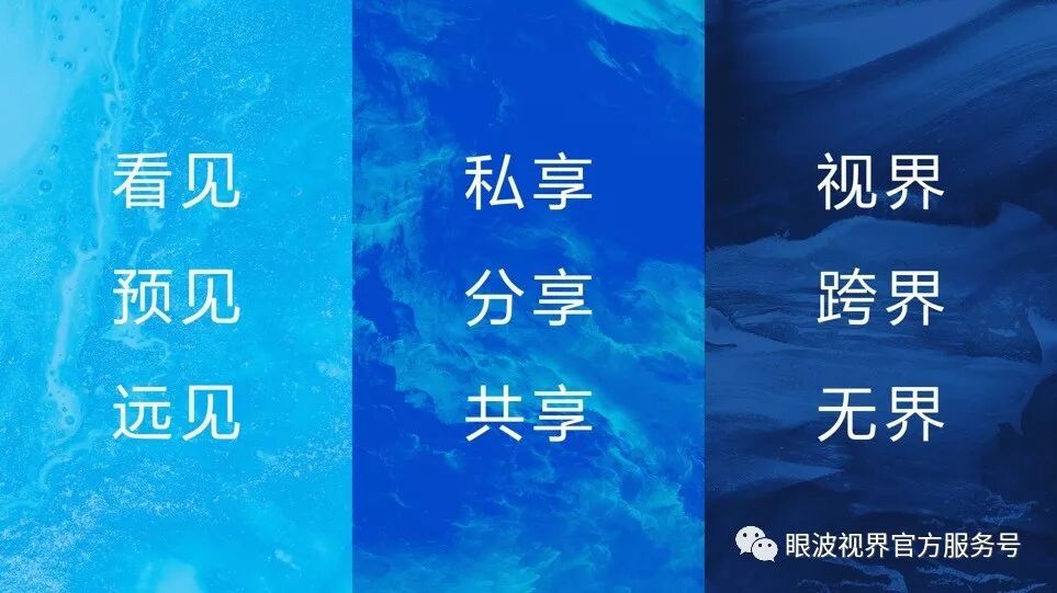“看见 预见 远见”、“私享 分享 共享”、“视界 跨界 无界”是杨总提出的核心战略。视界是为了让所有人看的更清楚,眼波视界相信在开拓市场疆域的过程中,必定会预见更多远见卓识的同伴,共同开创伟业。