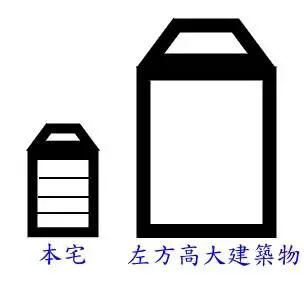 住宅前面对的大楼后方有一座稍高的大楼,顶部凸出了部分,宅内人易犯盗劫、出不良少年、或家中招盗窃。