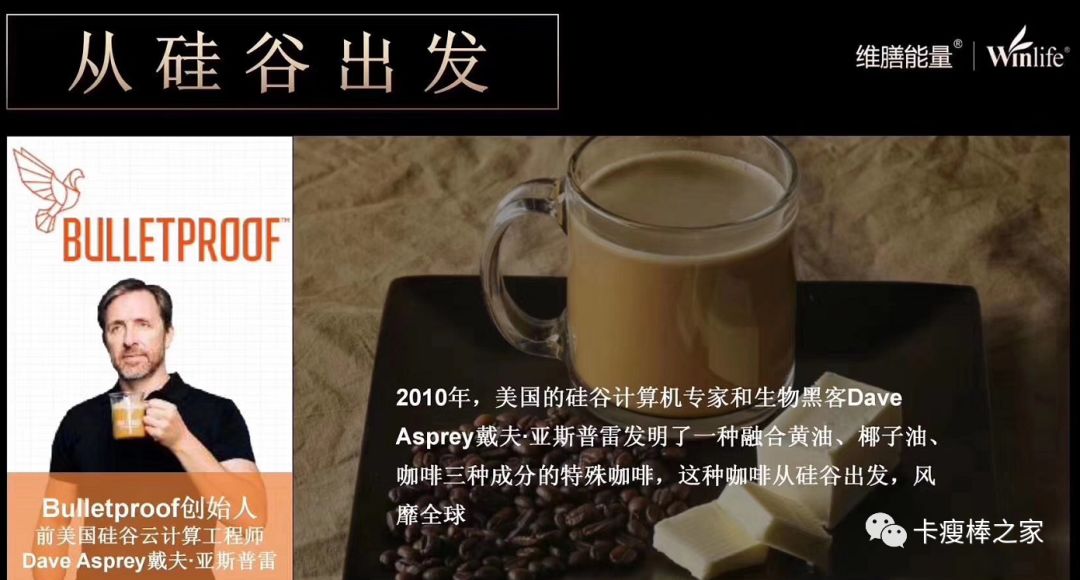 维膳能量-防弹生酮营养棒,它怎么被发现的呢?原理是什么?使用方法是怎么样的呢?吃的过程里面要注意什么问题呢?又是如何火爆全球的?那防弹咖啡是怎么样从硅谷出发?开始风靡全球,那他有怎么样的一个发现经历呢,他的故事是怎么样的呢,那下面我们来一起听一听防弹咖啡,在全球被发现的历程在全球怎么样开始风靡的故事。故事的发生是这样的,在2010年的时候,美国硅谷有一个计算机专家和一个生物黑客,名字叫戴夫,他发明了一种融合黄油,椰子油和咖啡三种成分,而特制而成的特殊的咖啡,这个咖啡呢,他号称能够减肥。并且能够使人精力旺盛,同时还能益智大脑。在硅谷呢?这些从事高科技的人士呢,都有一个爱好,就是爱喝咖啡。