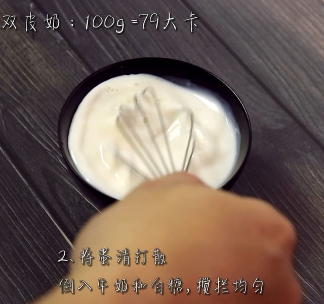 2、将蛋清打散,倒入牛奶和白糖,搅拌均匀