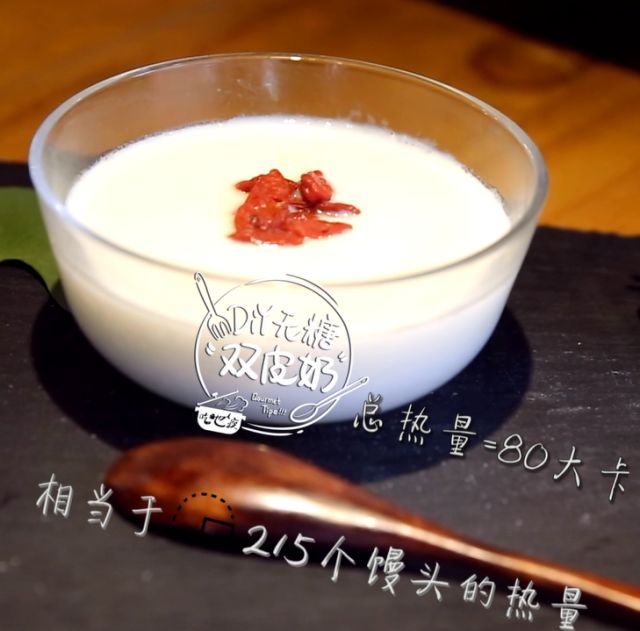 双皮奶,之所以叫“双皮奶”,是因为它的表面有一层需要两次凝结才形成的厚厚的奶皮。先将煮好的牛奶倒入碗里,自然凝结成一层奶皮之后,将牛奶倒出,与蛋清砂糖混合后,重新倒回碗里,让奶皮浮起来。之后再上蒸锅——蒸完的牛奶,冷却过程中会再次凝结一层奶皮。需要两次凝结,才形成了双皮奶表面特有的厚奶皮。
