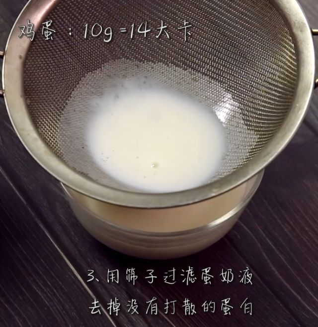 3、用筛子过滤蛋奶液, 去掉没有打散的蛋白