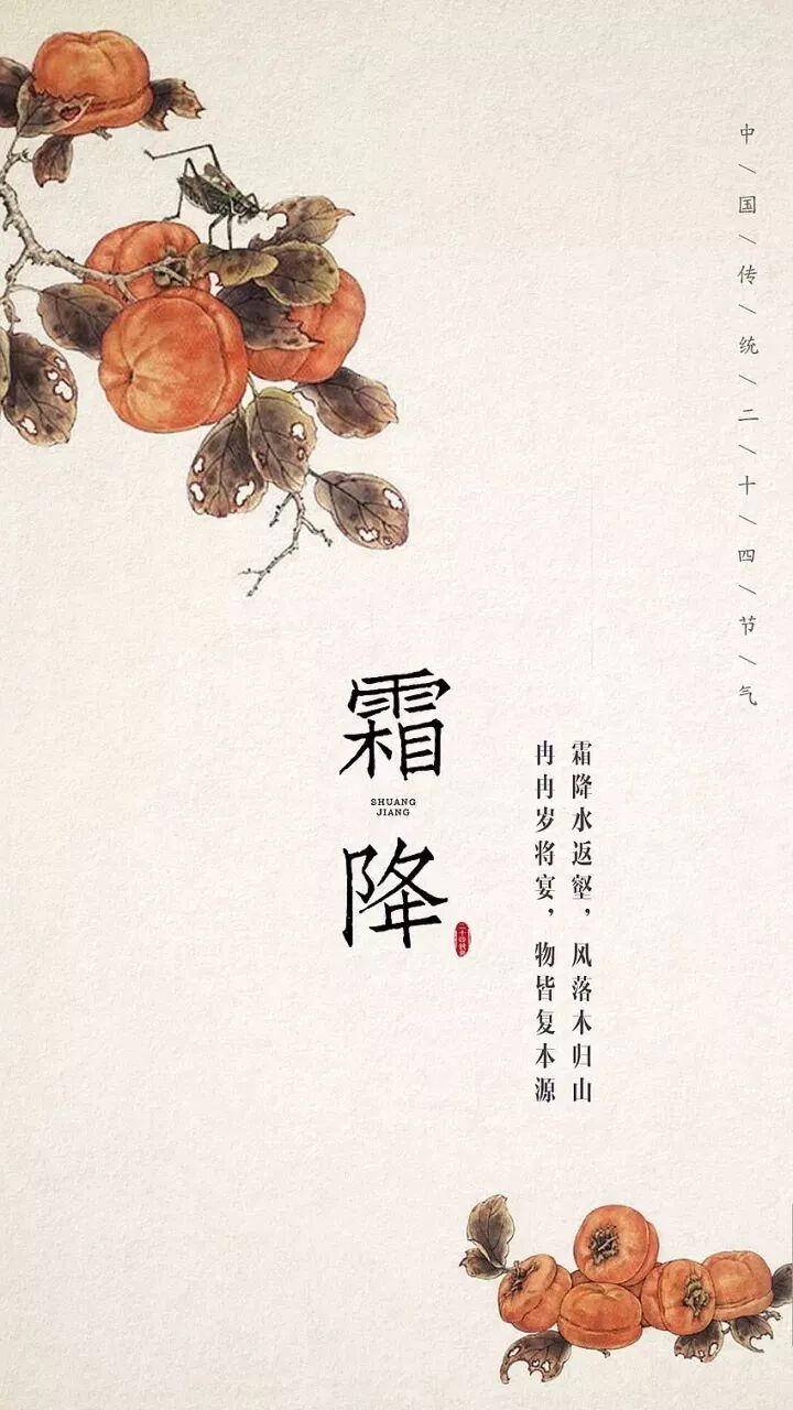 有些地方有霜降吃柿子的习俗,认为:“霜降吃柿子,冬天不感冒”。柿子一般是在霜降前后完全成熟。还有栗子和萝卜,都是霜降时的养生佳品。