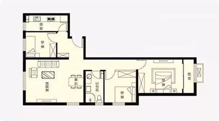 这种格局幽深狭长,采光又不好,让人顿生孤独压抑之感,而且厨房还挨着卧室,简直是躁动之源。