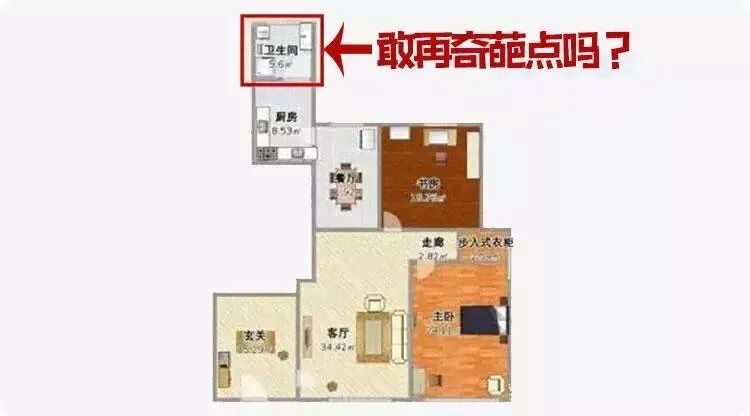 这个算我见过的最奇葩的户型了,第一眼觉得还好吧,再细看不得了,卫生间离大门太远了!