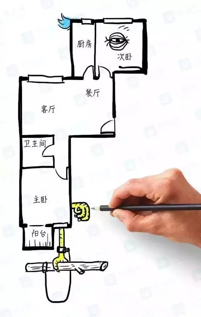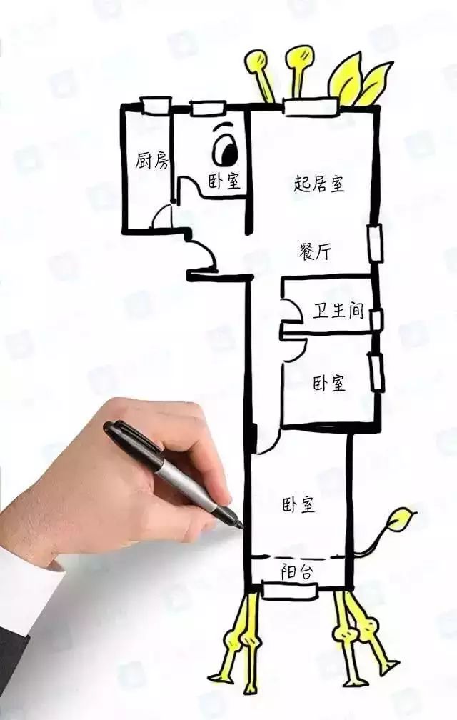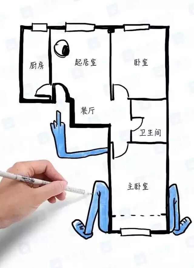 10、典型的手 枪 户型,风水不好。动线交叉,行动不便,客厅被各种门和通道连接,电视放在哪里也很难定夺。