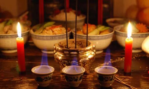 祭祀祖先是除夕的第一件大事。在我国很多地方,这一天,民众都会在家中摆上丰厚的饭菜,点燃香烛,家长率领子孙们叩拜。在一些农村,大年三十傍晚时分,会在祖宗像前点上香烛,倒上美酒,摆上菜肴,全家人举行隆重的祭祀仪式,表达“慎终追远”的感情。等各位先人用过年夜饭之后,人们才开始享用。