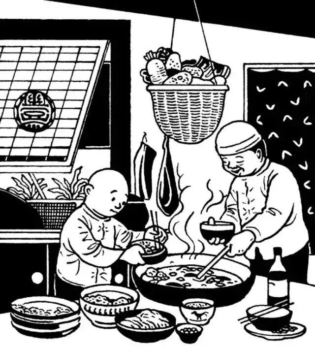 大年初四这一天全家在一起吃折罗。所谓折罗,就是把几天剩下的饭菜合在一起的大杂烩,打扫年货。