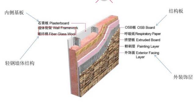 1.外墙对外侧:玻璃纤维棉填充到轻钢结构中,然后分别装钉结构板(即OSB板)、防潮呼吸纸、挤塑板(抗寒保温作用)、装钉钢丝网、粉刷层(两层水泥砂浆,一层粗糙、一层光滑)、文化石施工(或挂板、喷涂用户所喜爱的涂料等)作为外墙装饰。