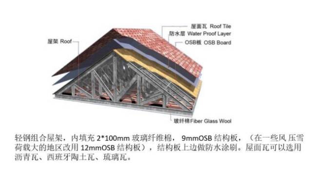 4.屋面(屋顶):将玻璃纤维棉填充到三角屋架或T型屋架底边,对外边按顺序分别装钉结构板(即OSB板),防水层(凸出/平面一层,凹处两层),屋面瓦施工(屋面瓦可以采用欧式沥青瓦、陶氏瓦和琉璃瓦等不受限制)