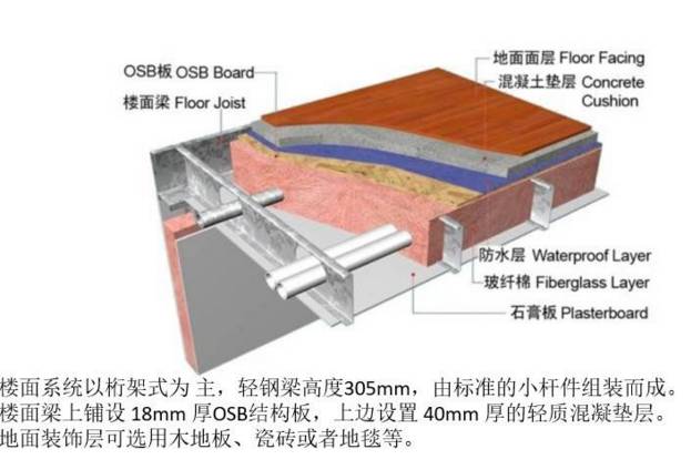 3.楼面:楼面梁内填充玻璃纤维棉,上侧按顺序分别装钉结构板(即OSB板),混凝土垫层(湿区地面需铺设轻质混凝土垫层并设置防水层),地面装饰层(可随意选择安装木地板、瓷砖和地毯等用户喜欢的装饰材料),楼面梁下侧直接装钉一层石膏板