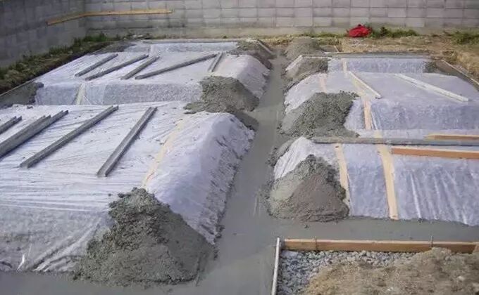 1 回填土按标高夯实后,在面层铺设一层250微米厚聚乙烯塑料膜作为防潮层,塑料膜利用重物压稳,防止被风吹跑。