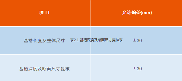 3 验槽:按表2.1进行检查,检查基槽长度及整体尺寸、基槽深度、断面尺寸等