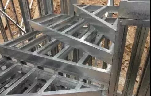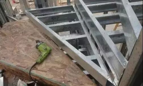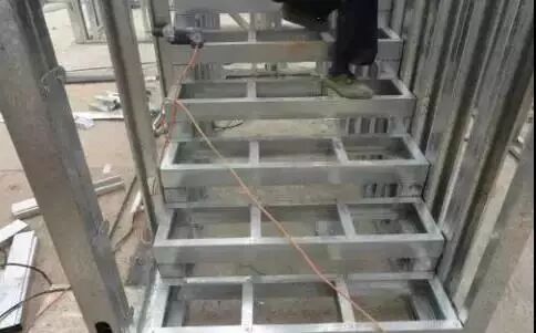 楼梯轻钢骨架拼装时严格按照《楼梯设计图》的尺寸,拼装方法参考楼梯墙拼装。