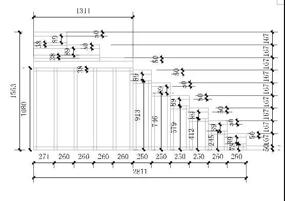 (1) 在放样前,靠近已安装好的墙体骨架,利用5m卷尺量出所有楼梯墙的外边线的定位点。