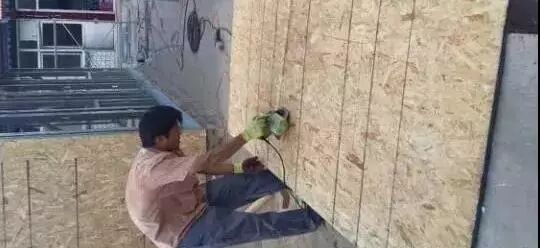 ②量取每个踏步的尺寸,在osb板上放样出每块踏步的形状,利用手持切割机将osb板切割。