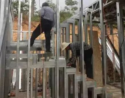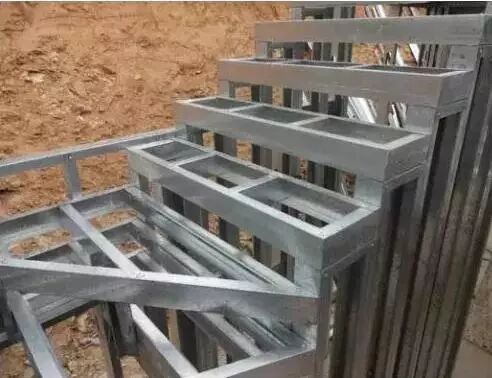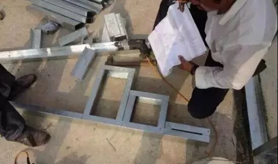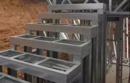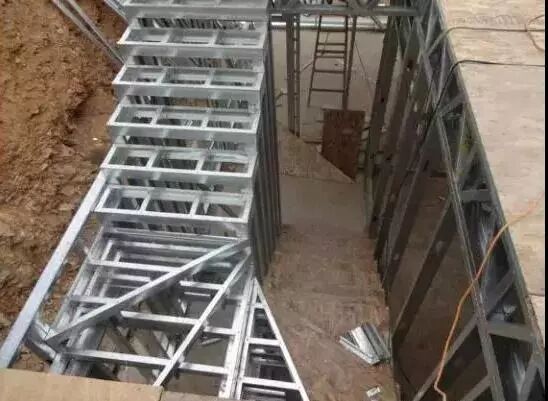 (1)先将顶导梁放置在拼装场地上,找到已选好的轻钢材料,开始拼装楼梯墙。