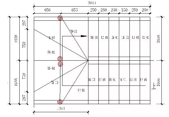 (2)第一根底导梁放样后,把相同的楼梯墙底导梁并排放置,利用直角钢尺将放样的点延伸至其它底导梁上。